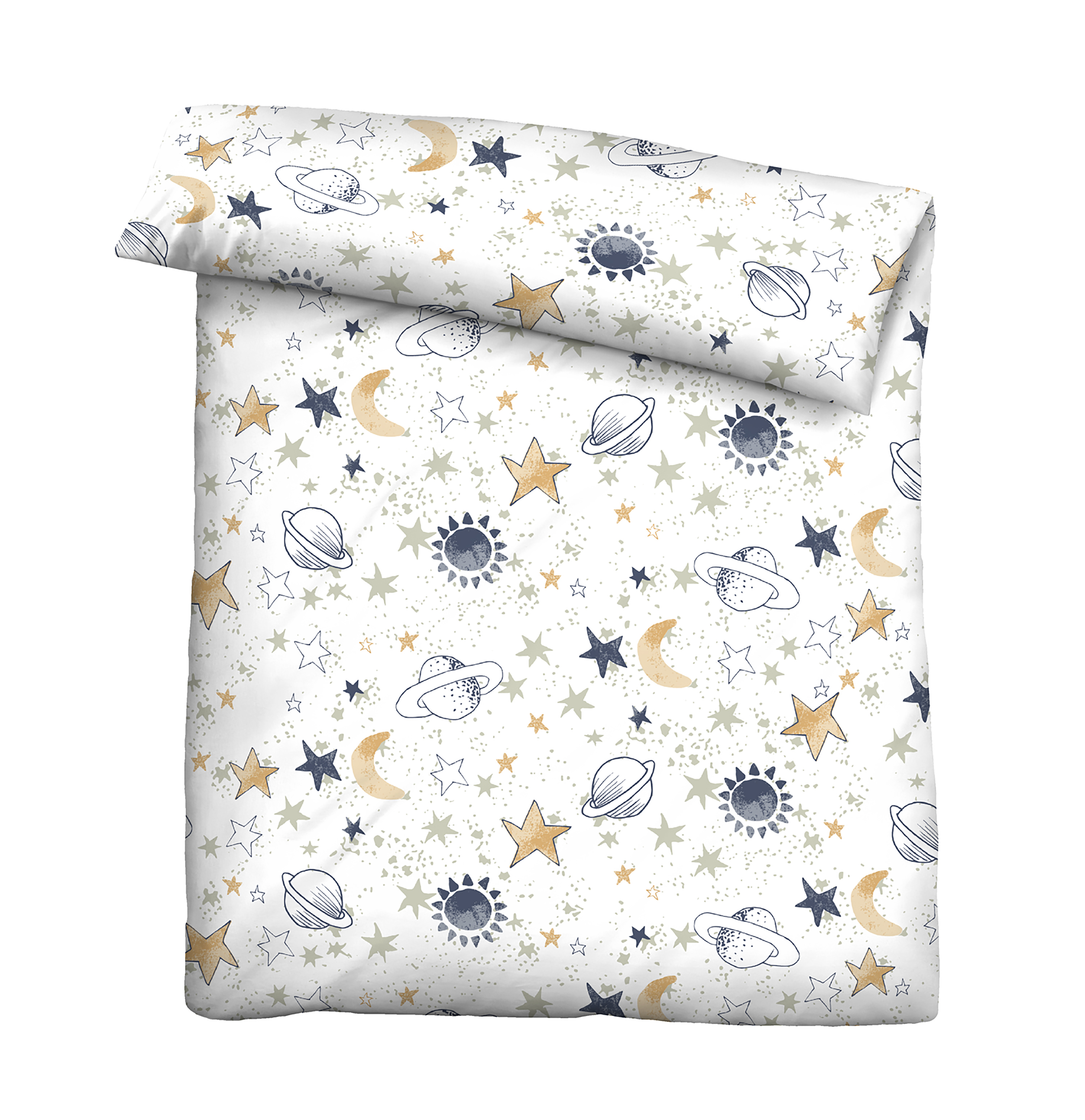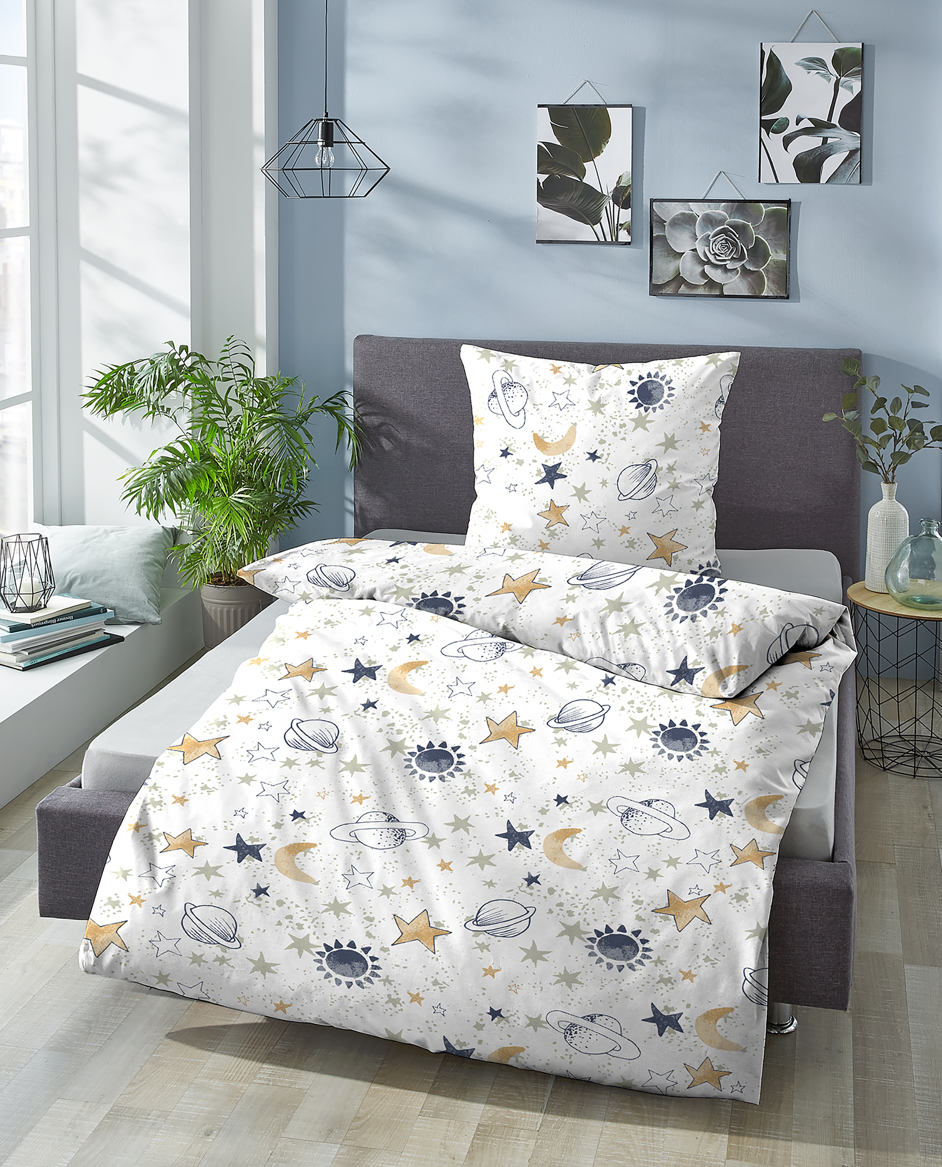 Diese bezaubernde Kinderbettwäsche mit Universum- Motiv bringt kleine Astronauten und Weltraumfans zum Träumen. Das liebevolle Design mit Mond, Sternen und Planeten macht das Bett zu einem echten Blickfang im Kinderzimmer. Perfekt für kleine Entdecker, die das Universum erkunden möchten!